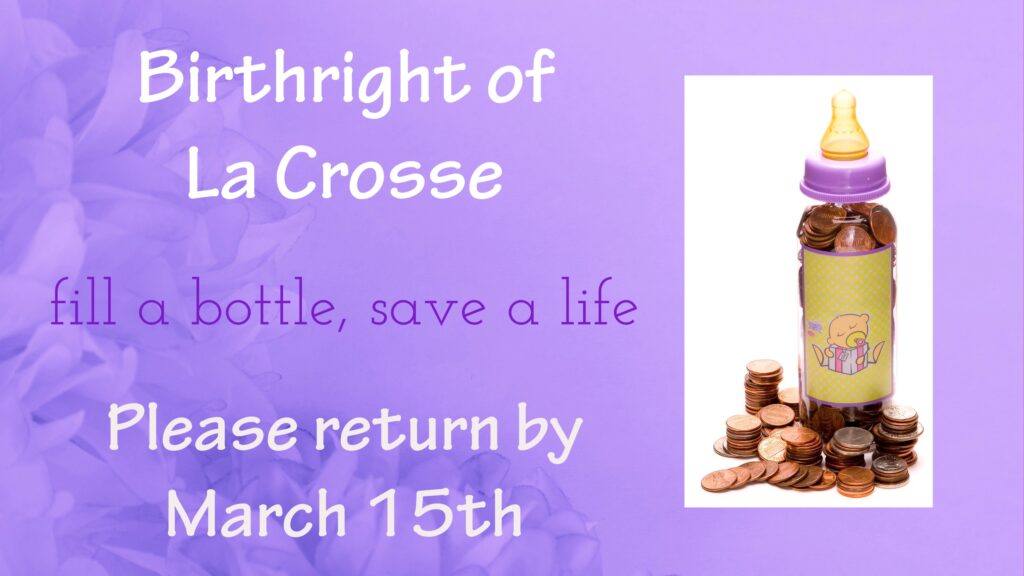 Our church is helping to support Birthright of La Crosse by filling baby bottles or envelopes with financial donations toward their work. Birthright helps women with unplanned pregnancies receive love and hope by offering them services, counseling, referrals, and resources so they feel able to choose life for their baby.  Bottles and envelopes are being collected through March 15th.